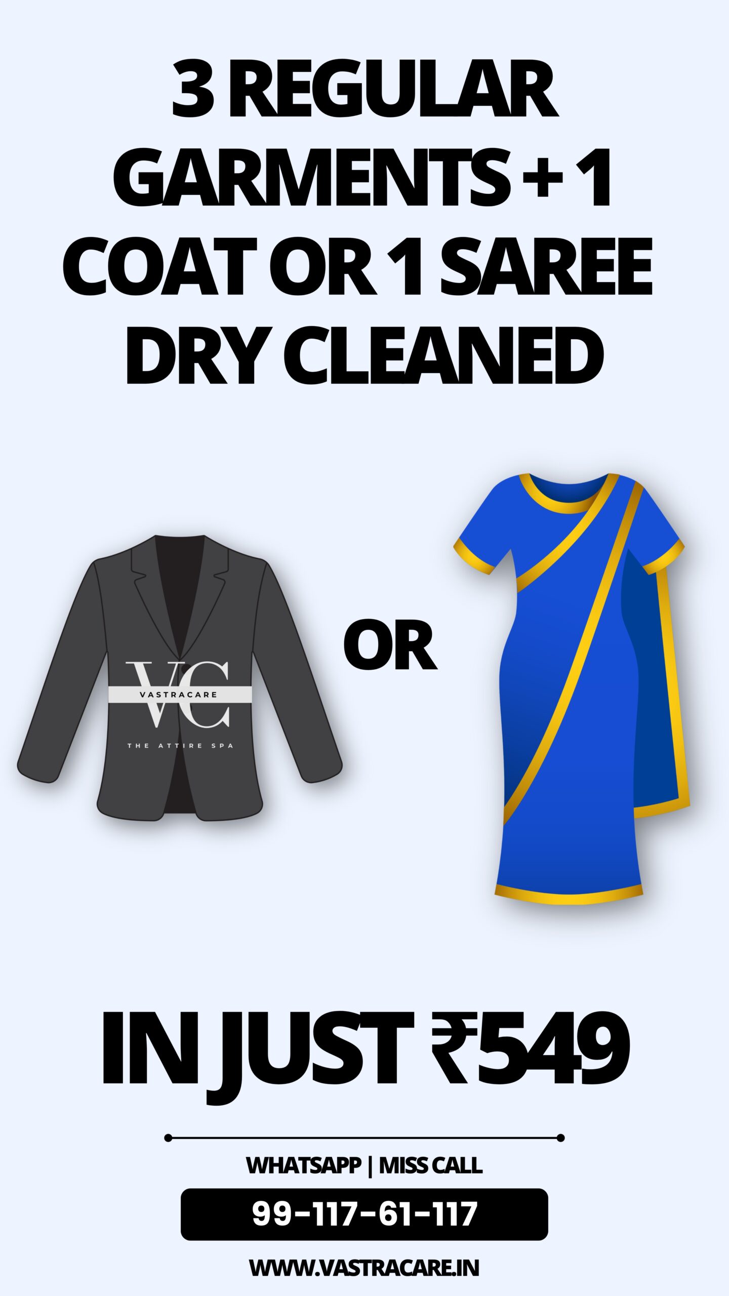 Get your 3 Regular Wear + 1 ‘Coat’ or 1 ‘Saree’ Dry Cleaned in Just ₹549.